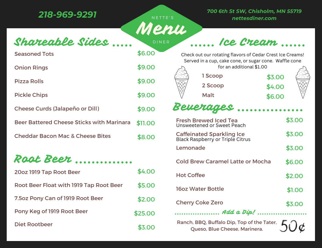 Welcome to Nette's Diner & Catering, a delightful gem nestled in the heart of Chisholm, Minnesota. Positioned at 700 6th St SW, this charming diner offers a nostalgic vibe reminiscent of the good ole days, making it a must-visit for food lovers and comfort food enthusiasts alike. Whether you choose to dine in or take advantage of their outdoor and drive-up layout, Nette's promises an inviting atmosphere paired with a menu that packs a punch of flavor.